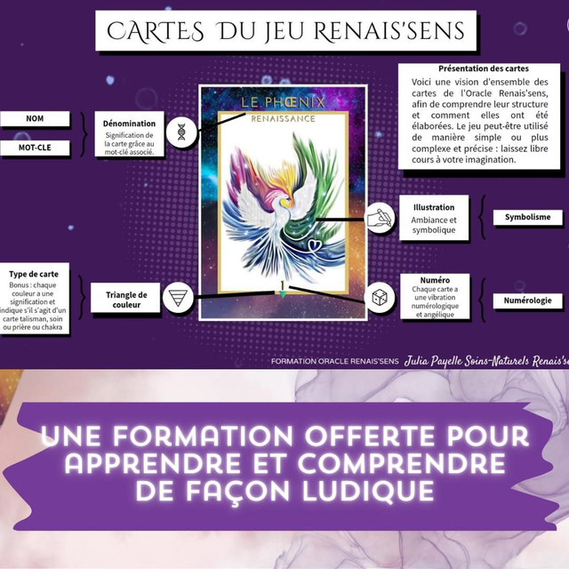 Grâce à cet oracle, je propose une véritable Renais'sens à soi pour se diriger plus sereinement dans sa vie. Avec douceur, votre âme s'exprimera pour vous accompagner vers le meilleur.